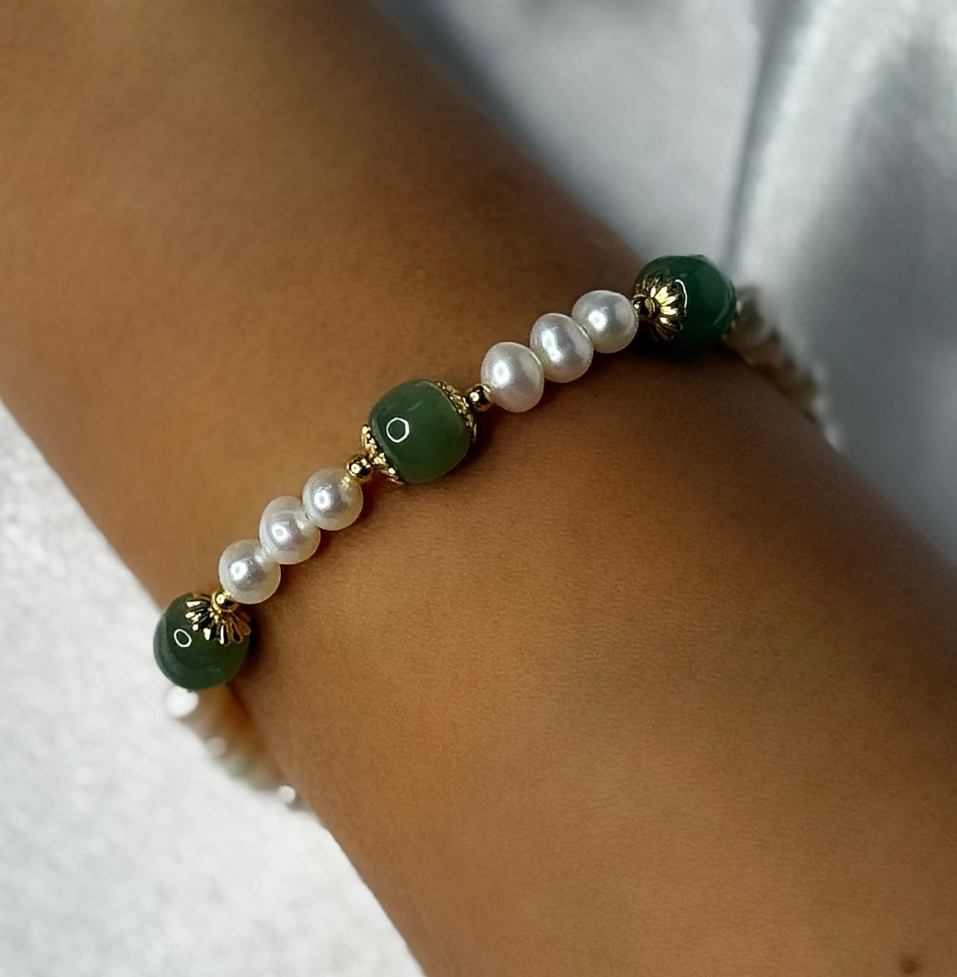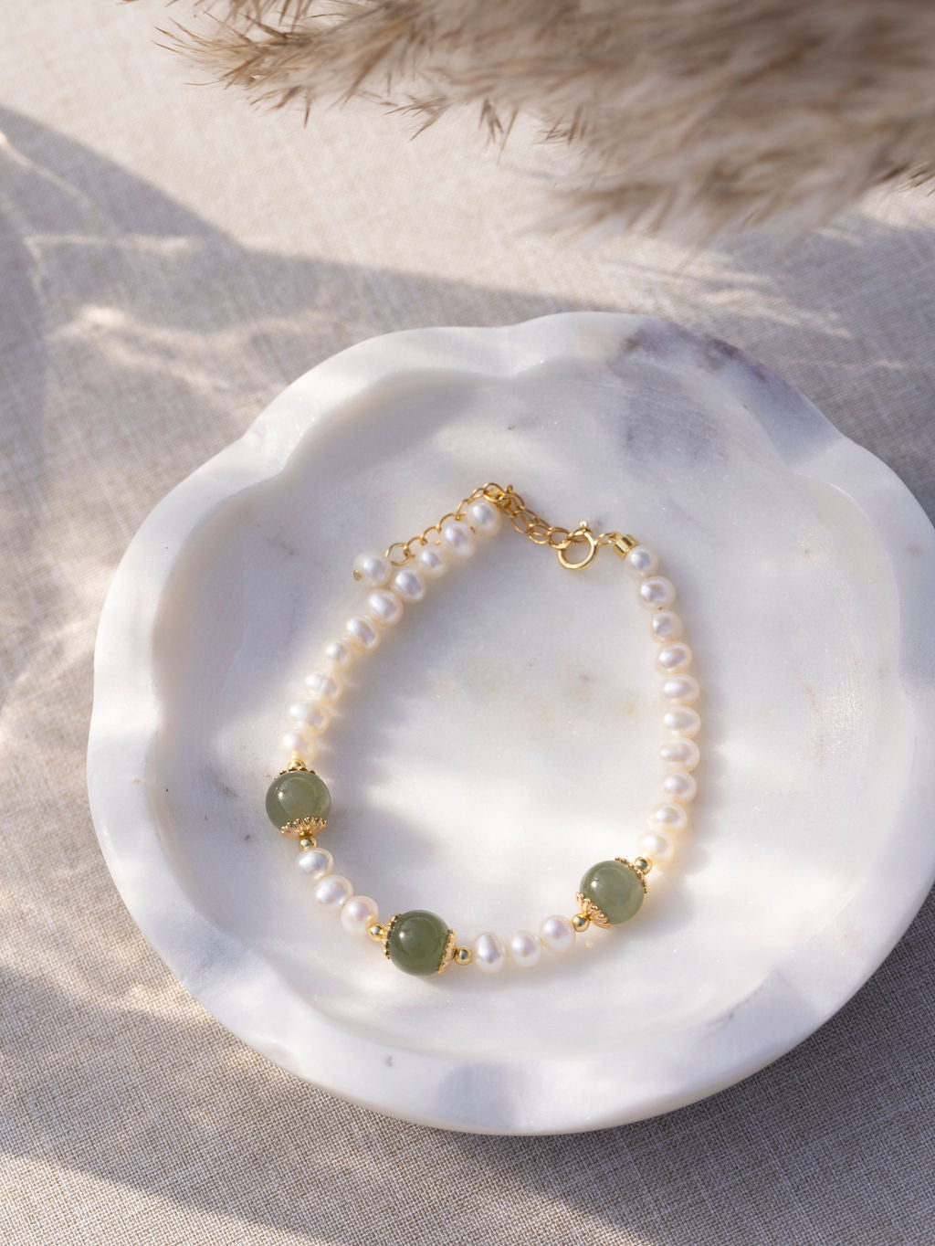 The Trinity Jade bracelet blends the timeless elegance of freshwater pearls with the natural beauty of jade. Featuring three delicate jade stones as the centerpiece, each jade bead is gracefully spaced apart by lustrous pearls, creating a harmonious, balanced look. With its adjustable design, this bracelet offers versatility and ease, making it a sophisticated choice for both daily wear and special occasions.