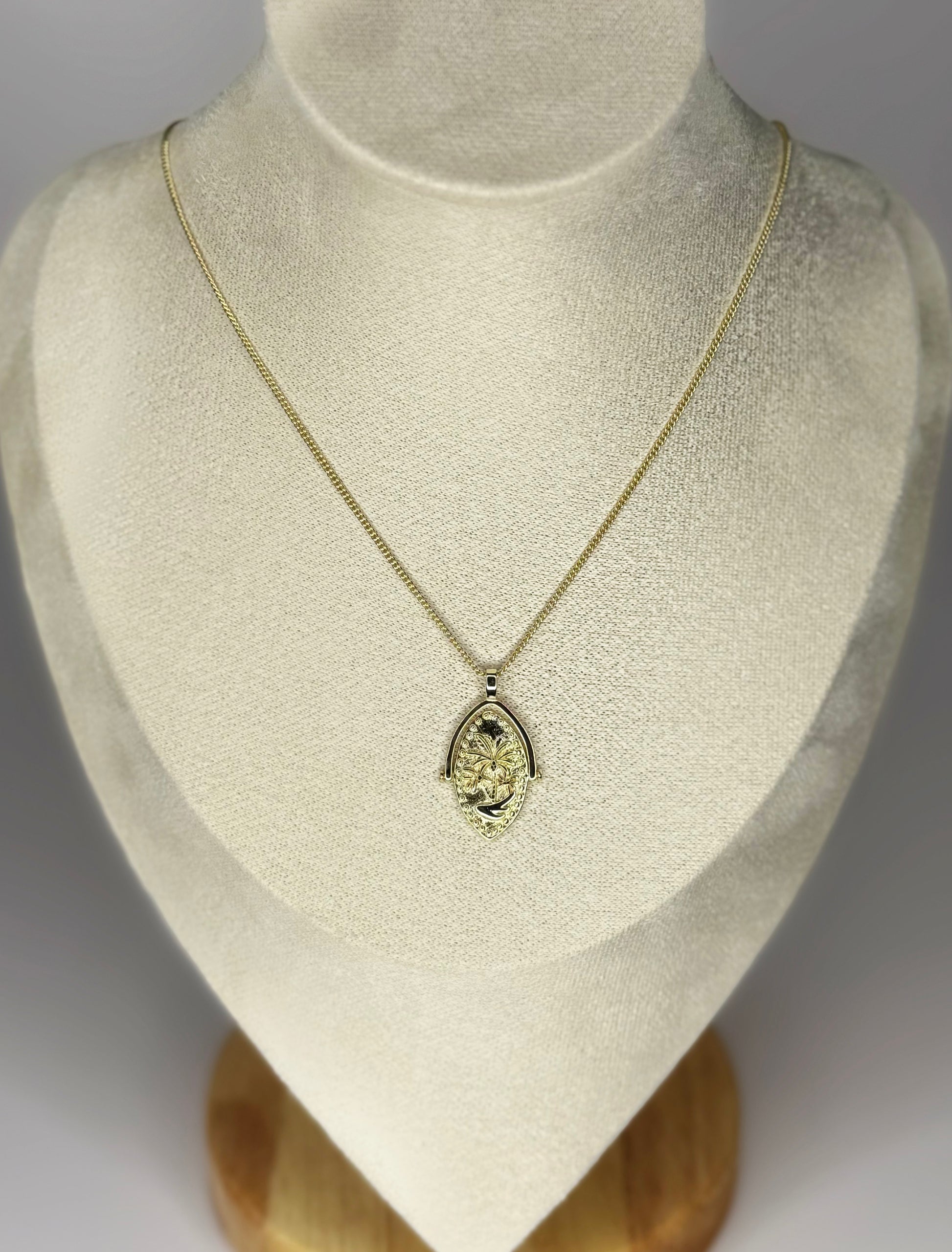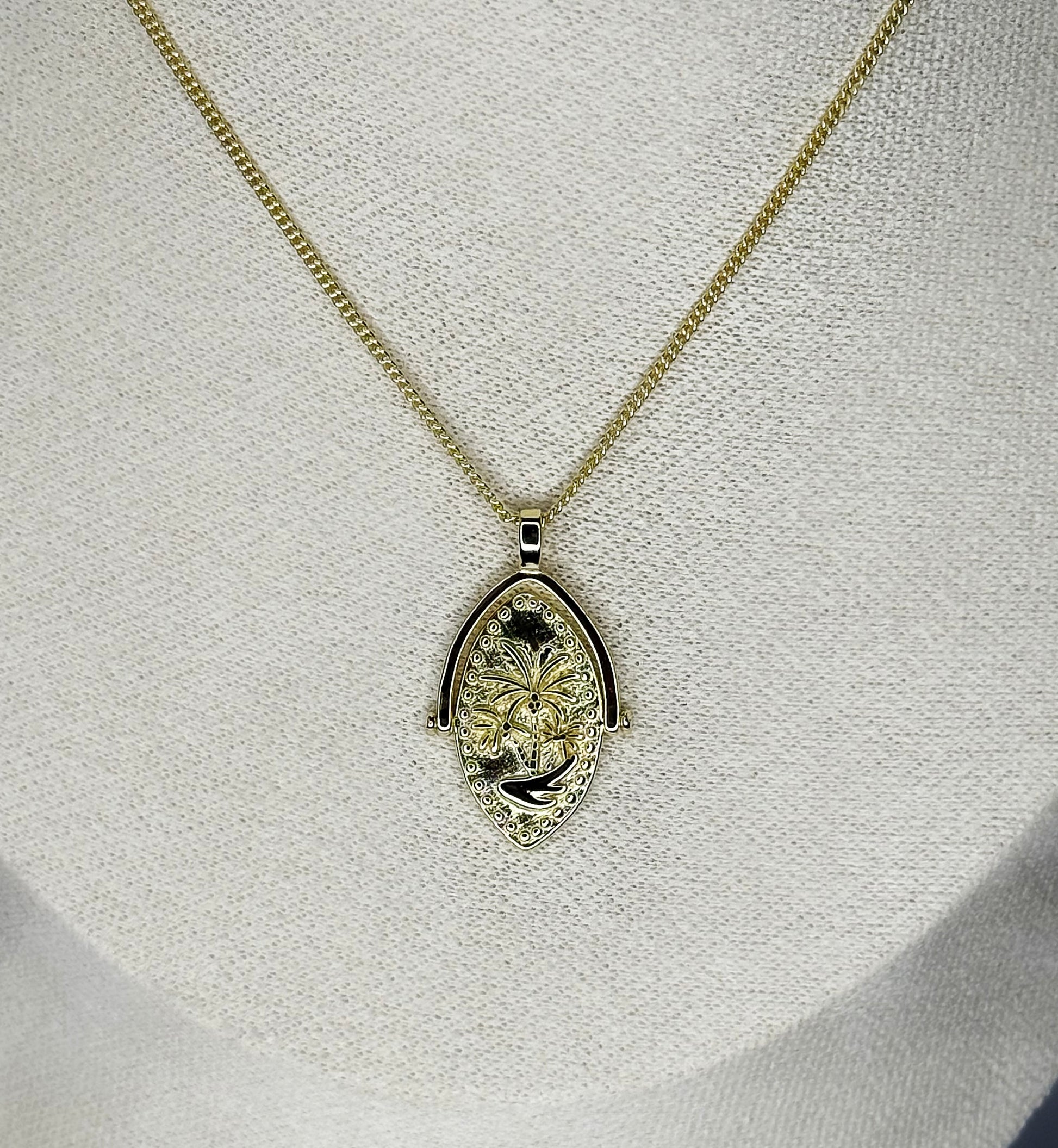 The Tropical Twist necklace brings a touch of paradise with its unique elongated oval pendant that twists at the top, featuring an intricate palm tree design. Crafted from 18k gold vermeil over sterling silver, this piece adds a breezy, tropical vibe to any outfit.