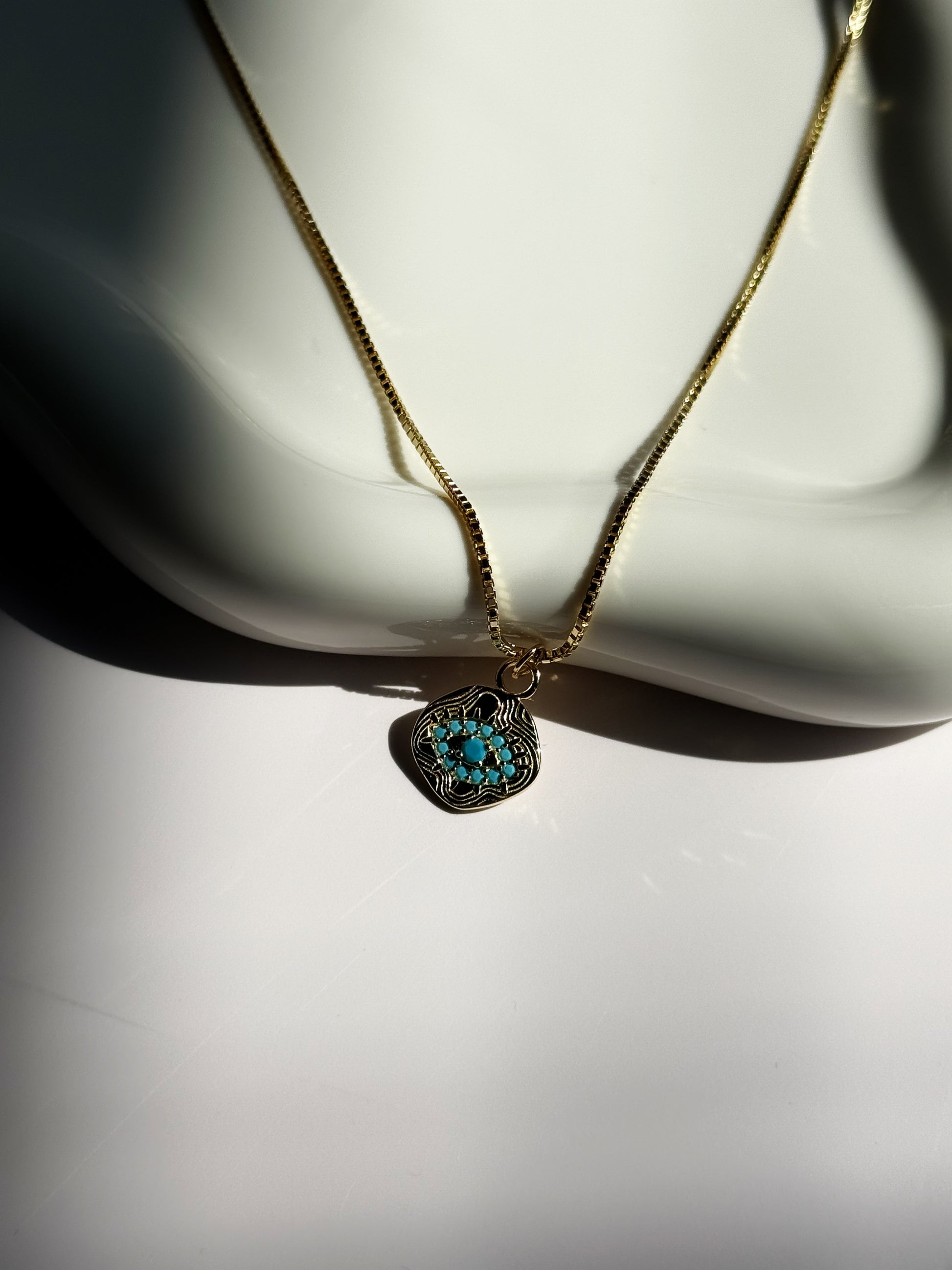 The Turquoise Gaze necklace is a striking symbol of protection and style. This round gold vermeil pendant features an intricate evil eye design with a natural turquoise stone at its center, believed to ward off negative energy. Crafted from 18k gold vermeil over sterling silver, this piece offers a modern, meaningful touch to any outfit.