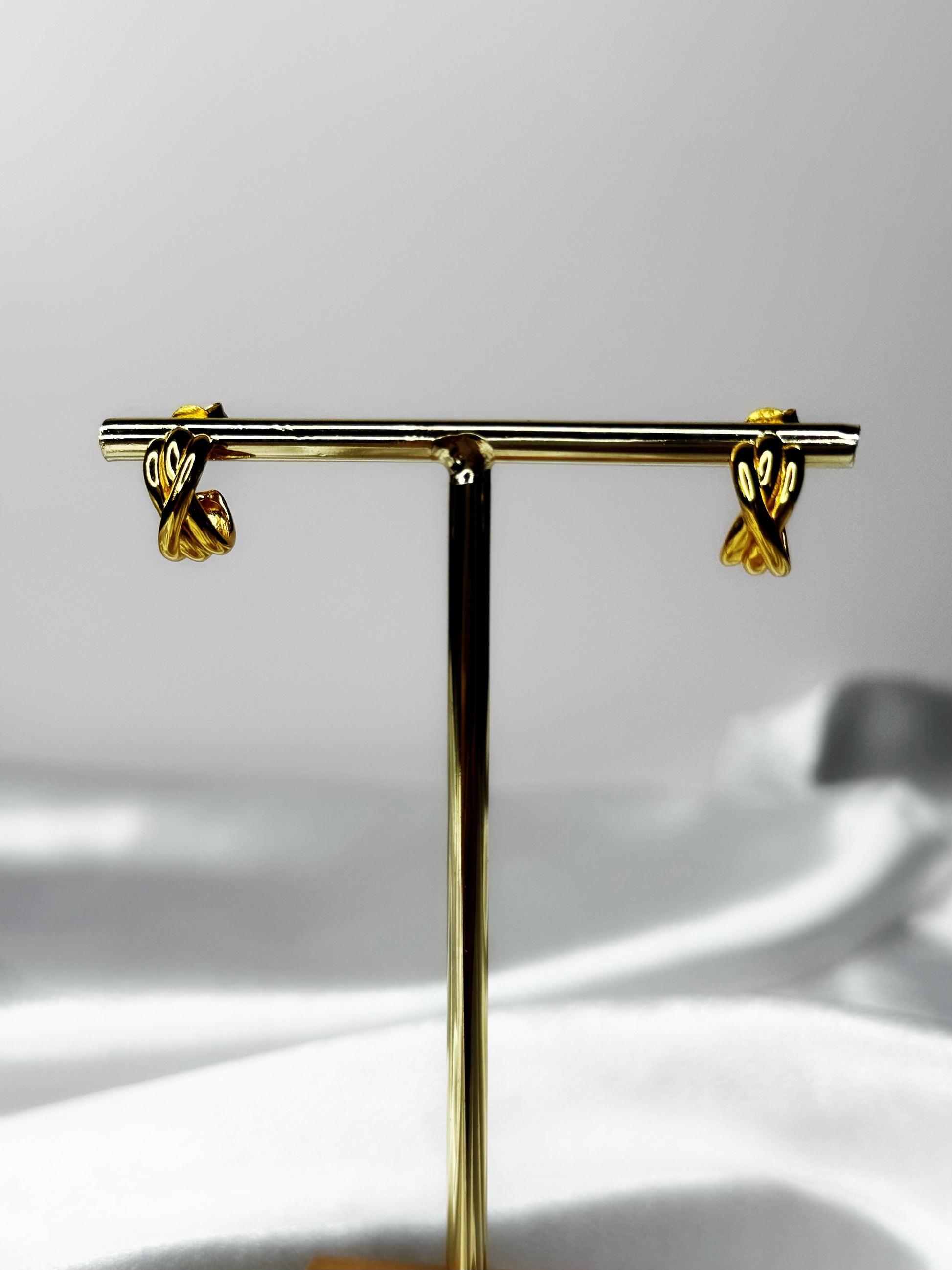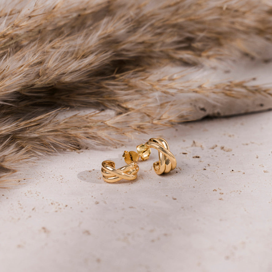 Elegant simplicity meets modern design in the Twine Curve Huggie earrings. Crafted from luxurious gold vermeil, these dainty huggies feature a unique interwoven design that mimics three delicate strands seamlessly connected into a graceful curve. One strand takes a diagonal path, adding a dynamic twist to the classic huggie silhouette. Perfect for everyday wear or layering with other earrings, the Twine Curve Huggies offer a refined yet playful aesthetic that complements any style.