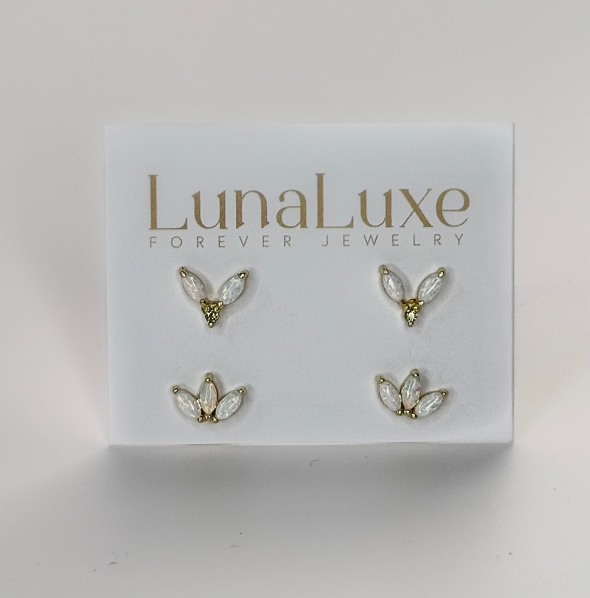 Introducing the Verdant Opal Bloom earring set , a stunning fusion of nature's beauty and timeless elegance. The Verdant Bloom studs feature a captivating green hue, accented by a delicate natural opal at the center, evoking the fresh vibrancy of spring. Paired with the Opal Blooming earrings, which showcase a mesmerizing opal surrounded by intricate detailing, this set symbolizes the delicate balance of nature's blooms. Together, these earrings offer a sophisticated, yet natural elegance, perfect for elevating your style with a touch of organic charm.