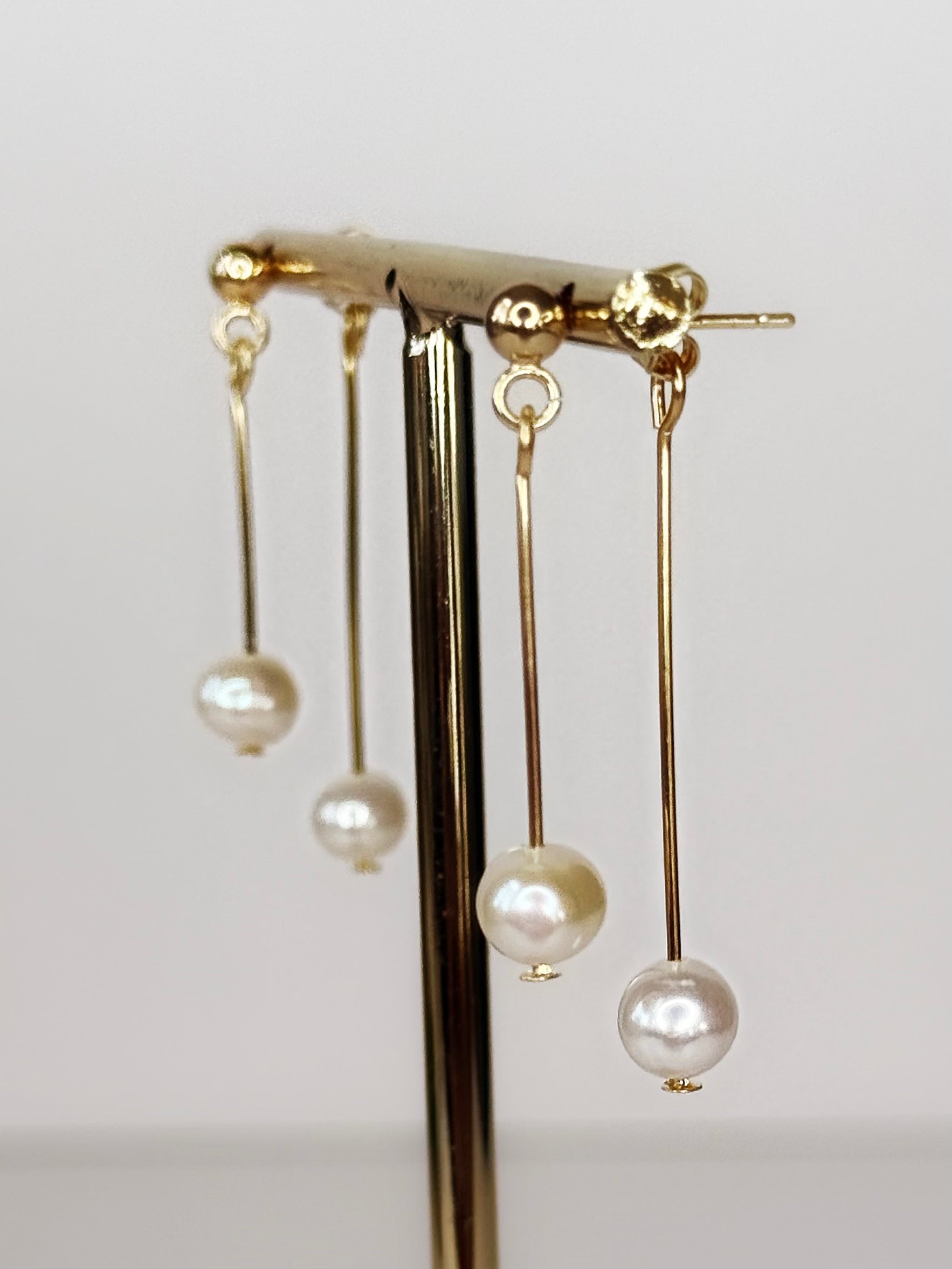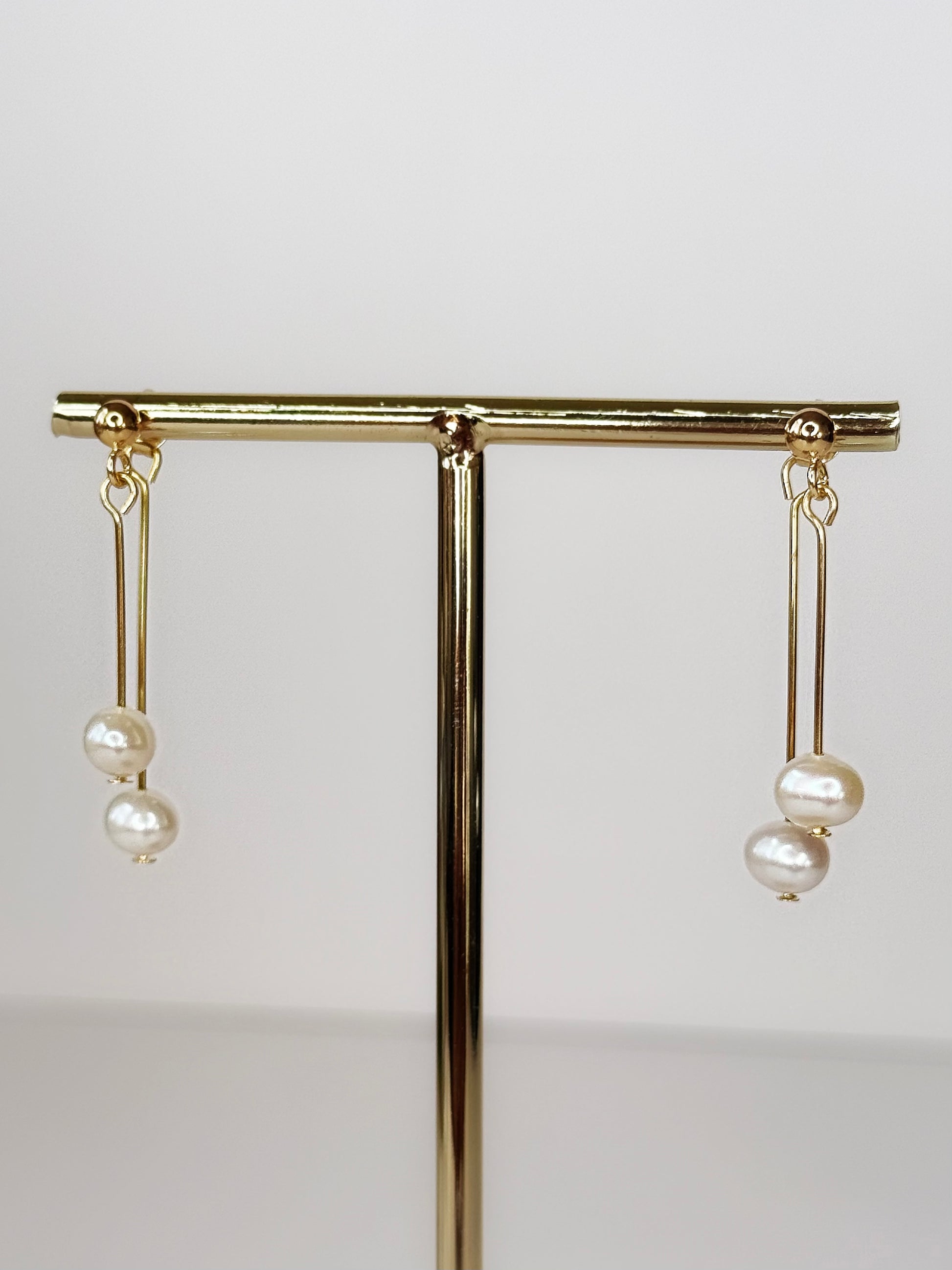 A slender gold bar gracefully suspends from the front, ending in a lustrous freshwater pearl, while the back features an elongated counterpart that extends just slightly longer, creating a mesmerizing dual-drop effect. The subtle movement and contrast in length add an air of effortless luxury, making them perfect for both elevated everyday wear and special occasions.