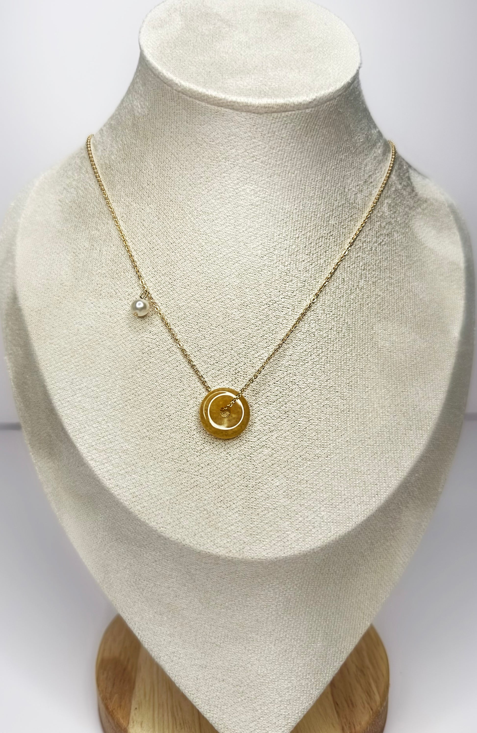 The Yellow Jade Bloom Necklace radiates warmth and tranquility, blending sophistication with timeless charm. This 18k gold-plated chain is delicately accented by an off-centered freshwater pearl and a striking natural yellow jade pendant. Its vibrant golden hues and elegant design make it a versatile piece for everyday wear or special occasions. Adjustable from 16 to 18 inches, it offers a comfortable and customizable fit for any neckline.