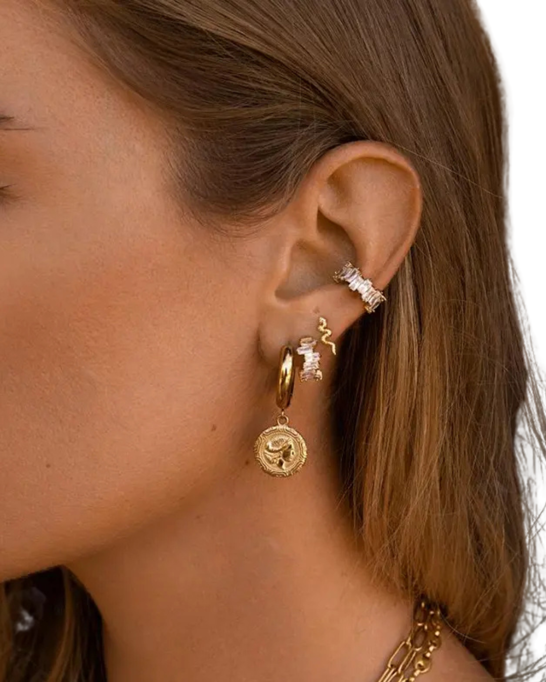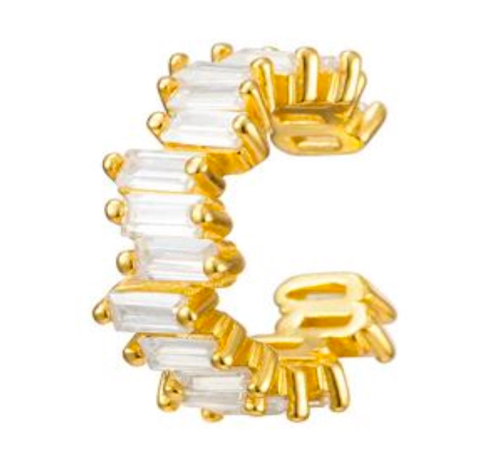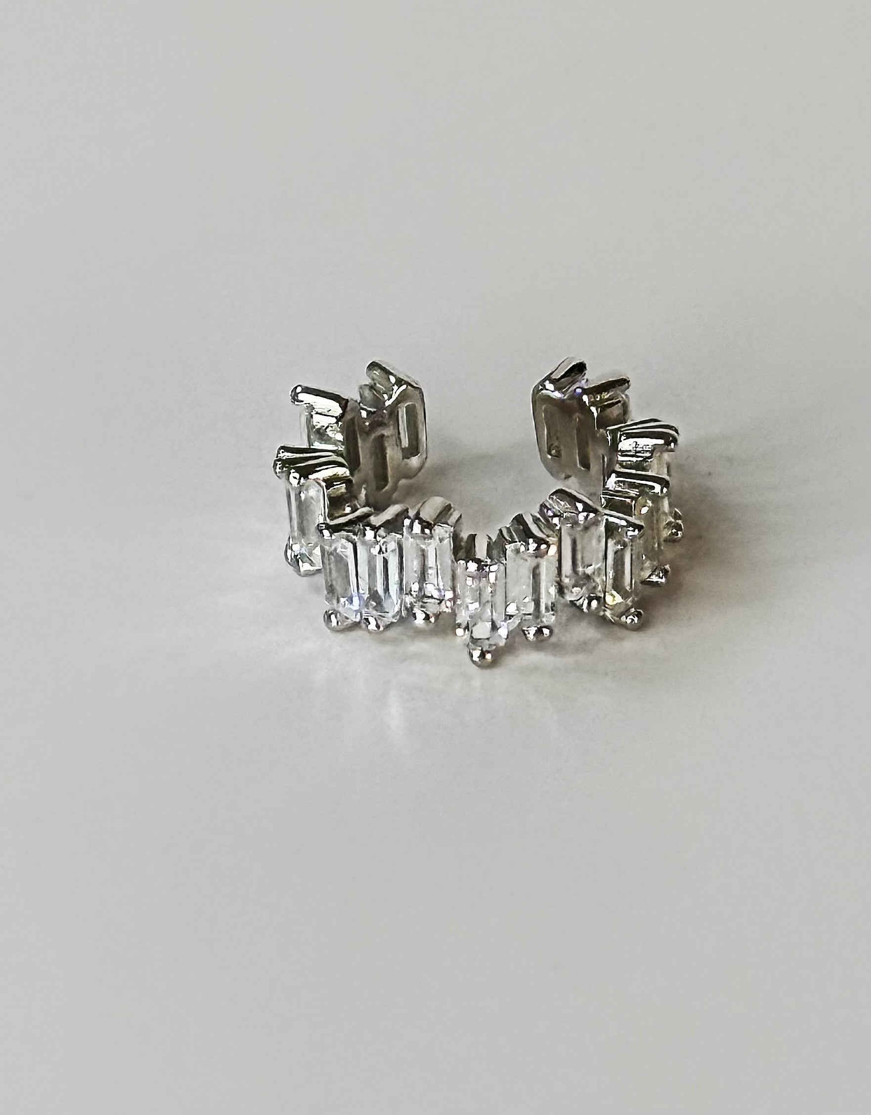 The Zara Zigzag Ear Cuff showcases the elegance of natural zircon stones in a striking emerald-cut shape. Each stone is arranged in a dynamic, alternating vertical pattern, creating a bold and geometric design that wraps around the ear. Available in 14k gold plating or Platinum Plating over sterling silver, this ear cuff adds a sophisticated touch to any look.